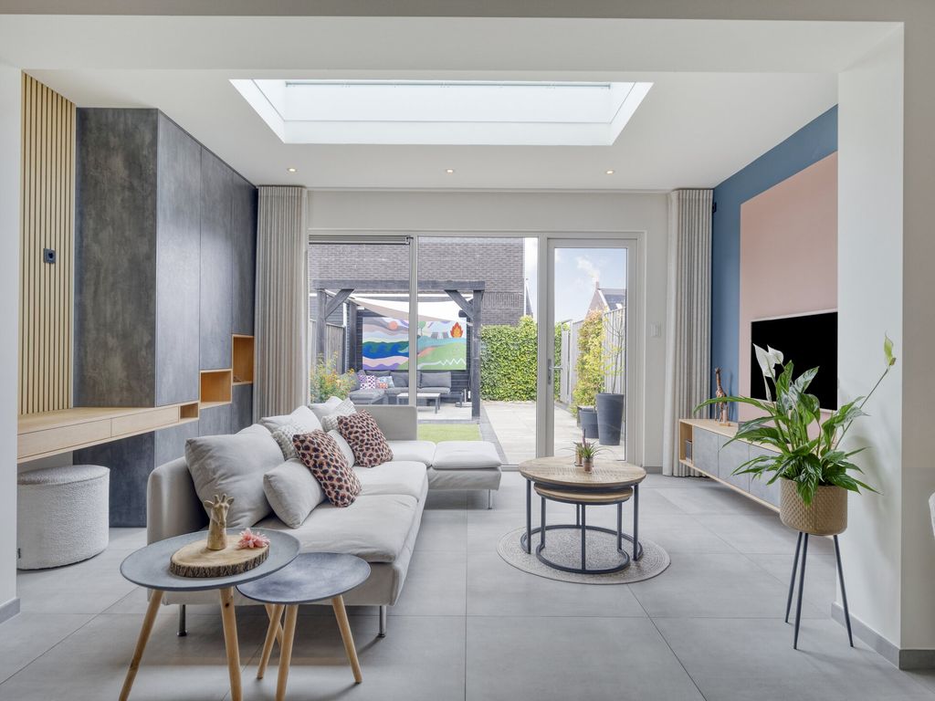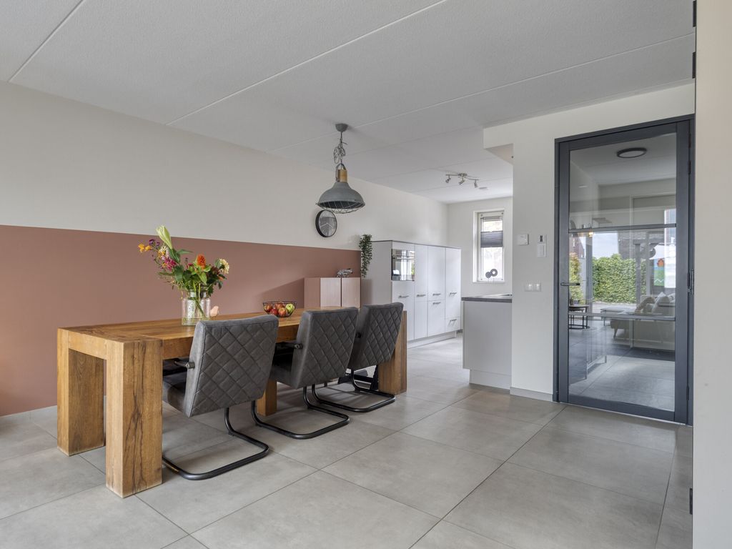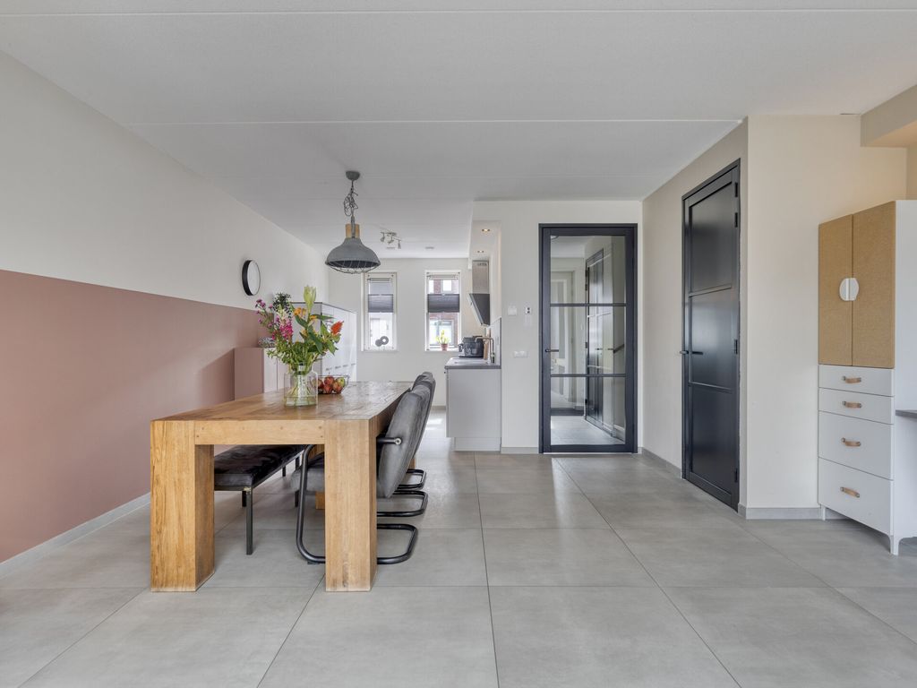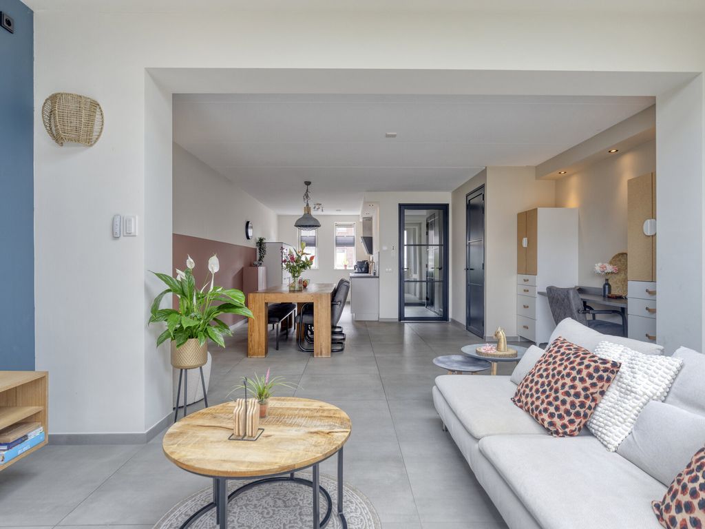 De woning betreedt u aan de voorzijde direct vanaf de stoep. In de hal bevinden zich de meterkast (8 groepen), een opbergkast met waterontharder, een moderne toiletruimte met fonteintje en de trapopgang. Vanuit de hal loopt u door naar de woonkamer: een lichte en royale leefruimte met grote raampartijen en vloerverwarming onder de lichtgrijze tegelvloer. De open keuken ligt aan de voorzijde en is modern uitgevoerd met lichte kastfronten en een grijs werkblad. De keuken is compleet uitgerust met inbouwapparatuur: vaatwasser, koelkast, inductiekookplaat, moderne afzuigkap en combi-oven. Dankzij de flinke uitbouw aan de achterzijde is er een heerlijk ruime woonkamer ontstaan met volop plek voor een grote eethoek, een speelhoek voor de kinderen of thuiswerkplek en een comfortabele zithoek. De lichtkoepel zorgt voor extra daglicht. Via de openslaande deur stapt u de netjes aangelegde en onderhoudsvriendelijke tuin in. Onder de trap bevindt zich een praktische bergruimte.