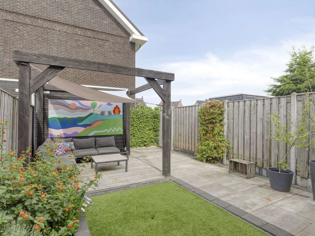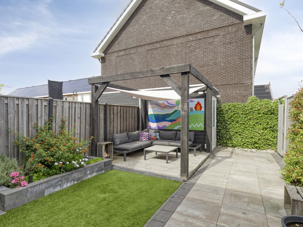 De achtertuin ligt op het noordoosten en is onderhoudsvriendelijk aangelegd met een vlonderterras met pergola, kunstgras en een plantenborder, ideaal voor spelende kinderen en zomerse diners buiten. Achterin de tuin staat een houten berging, perfect voor fietsen en tuingereedschap. De tuin is bereikbaar via een achterom. In de directe omgeving bevindt zich een speeltuin.