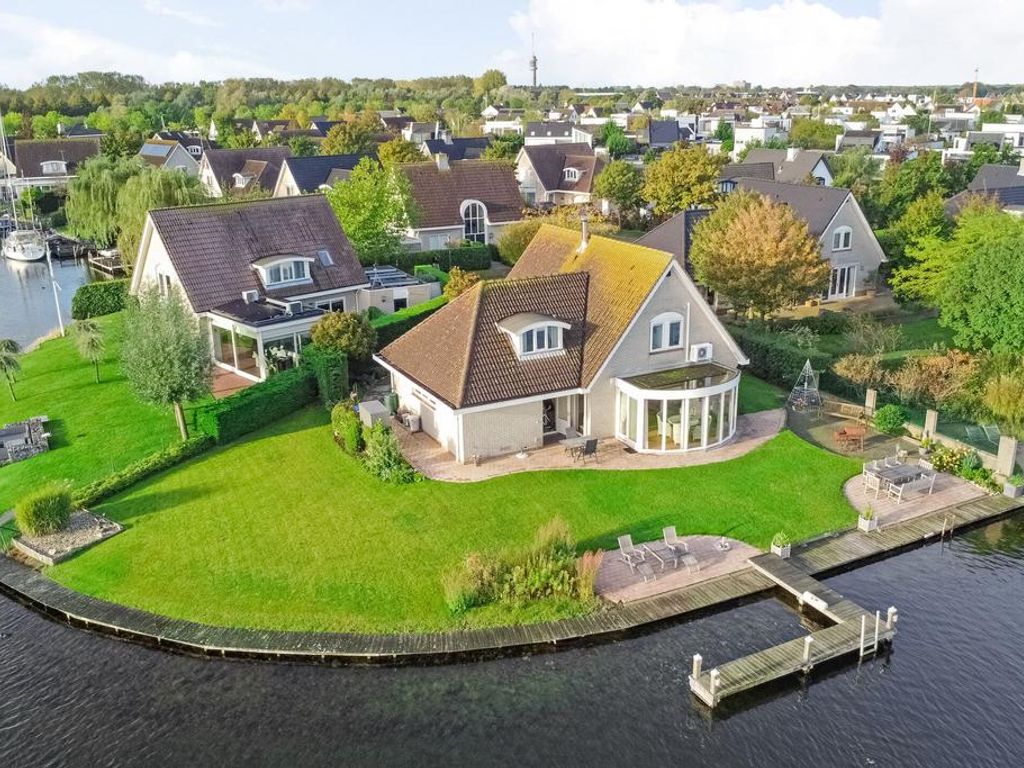 Rondom het huis is een fijne onderhoudsvriendelijke tuin aangelegd met een groot gazon aan de achterzijde. Volwassen struiken, groene hagen en grote bomen zorgen voor optimale privacy. Er zijn verschillende terrassen gemaakt. Het grote terras ligt aan de waterkant, waar u altijd van de zon kunt genieten. De andere twee terrassen liggen bij de serre en bij de steiger. Door de unieke lokatie heeft u vanaf elk terras een prachtig uitzicht op het Goese Meer.
