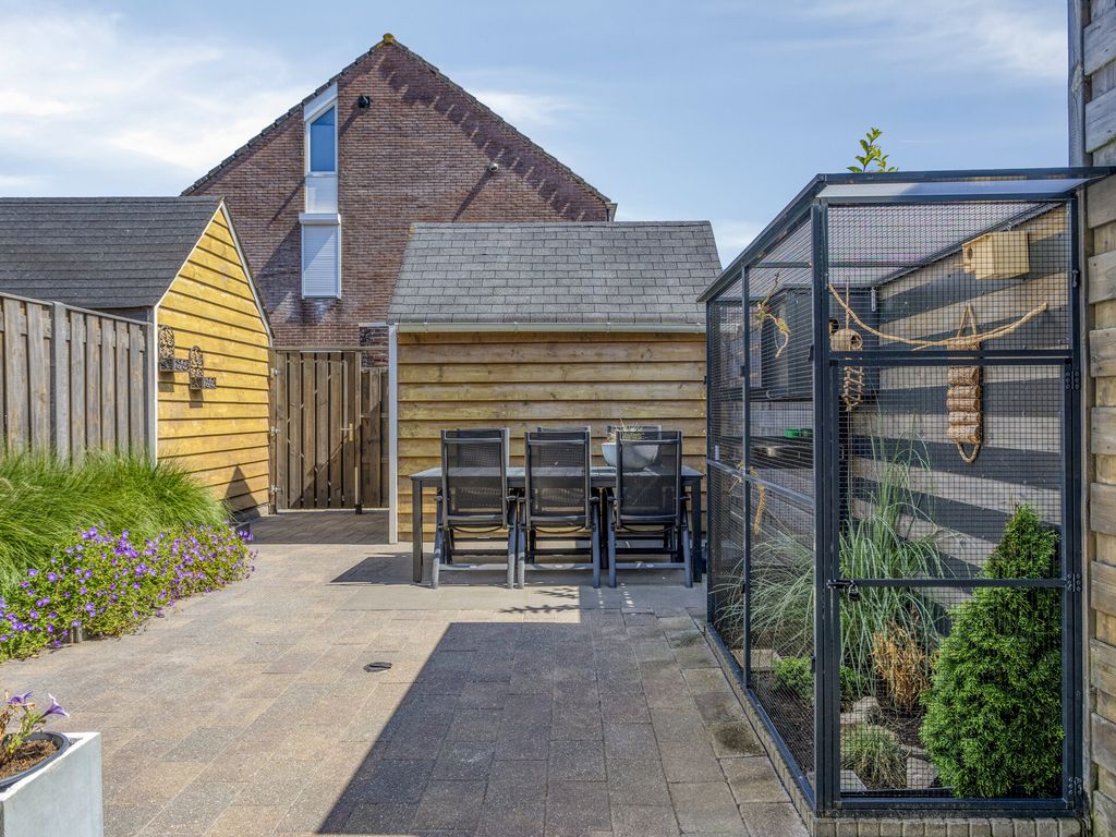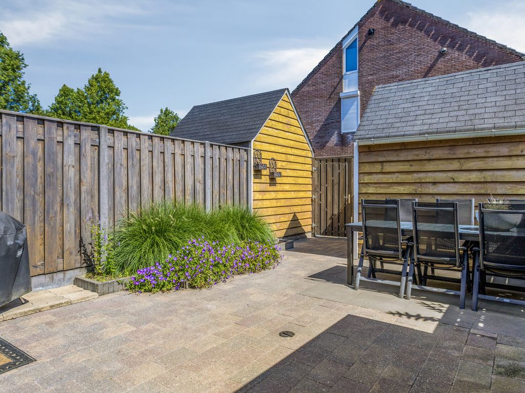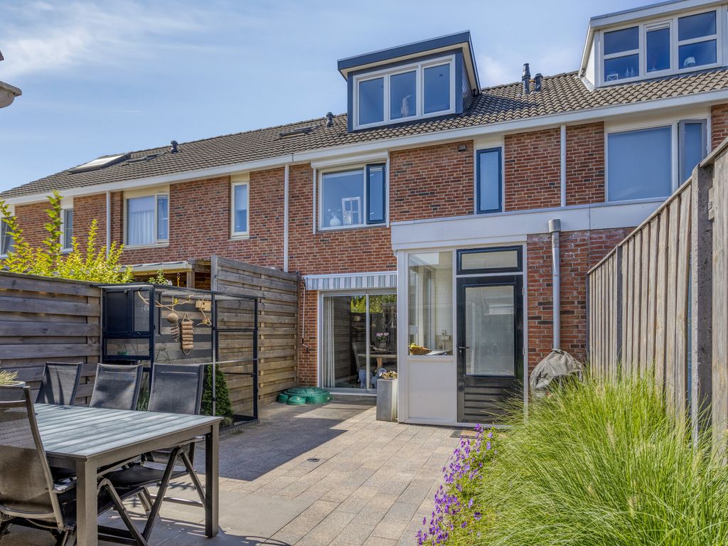 De achtertuin ligt op het noordoosten en is grotendeels bestraat, met een mooie plantenborder voor extra sfeer. Achter in de tuin staat een houten schuur met bergzolder, ideaal voor fietsen en opslag. De tuin is beschut, onderhoudsvriendelijk en voorzien van een eigen achterom.