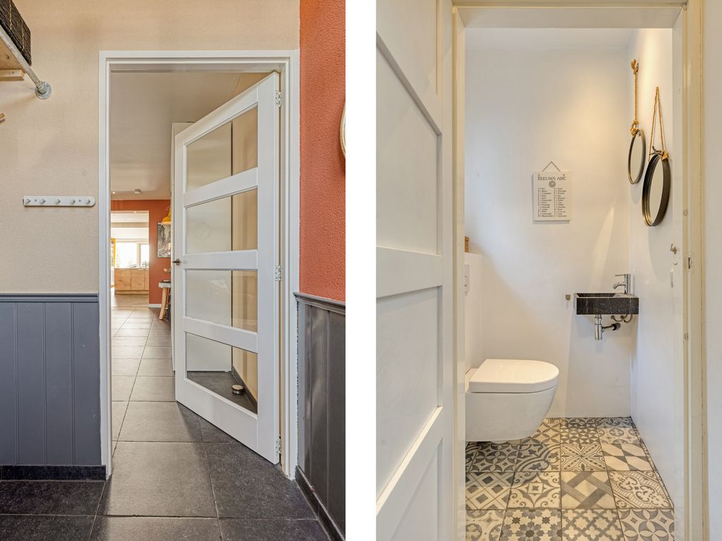 Grenzend aan de keuken bevindt zich de bijkeuken met aansluitingen voor wasmachine en droger en de opstelling van de CV-ketel (Intergas, 2024). Vanuit hier is het toilet met fonteintje bereikbaar. Een extra hal biedt toegang tot de tuin en is voorzien van een inbouwkast en een praktische douche.