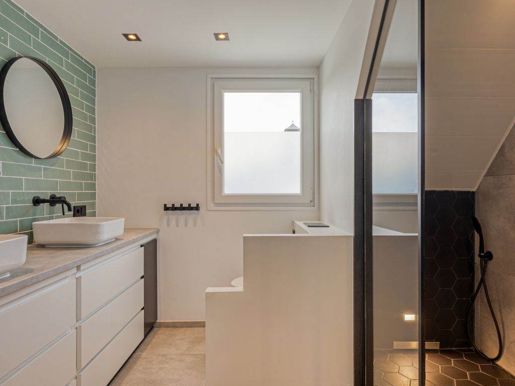 De badkamer is centraal gelegen en modern afgewerkt, met een inloopdouche voorzien van regendouche, een dubbel wastafelmeubel en een tweede toilet.