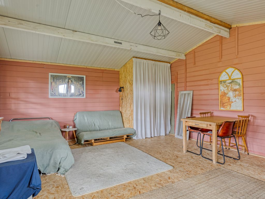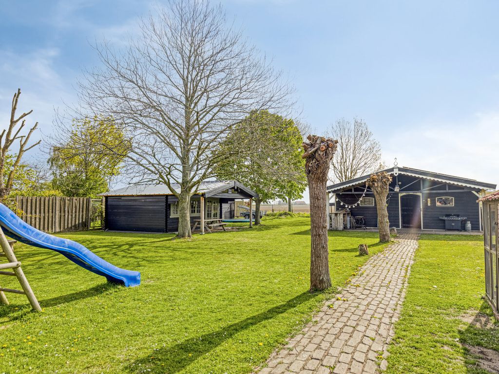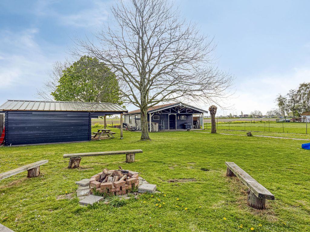 Achterin de tuin staat een grote schuur met daarin een kantoorruimte en een keukenblok. Dankzij de garagedeur is deze ruimte ook geschikt voor het stallen van bijvoorbeeld een oldtimer, bootje of andere materialen. Onder de twee karakteristieke kastanjebomen bevindt zich een ruim chalet, een multifunctionele ruimte die uitstekend kan dienen als gastenverblijf of hobbyruimte.