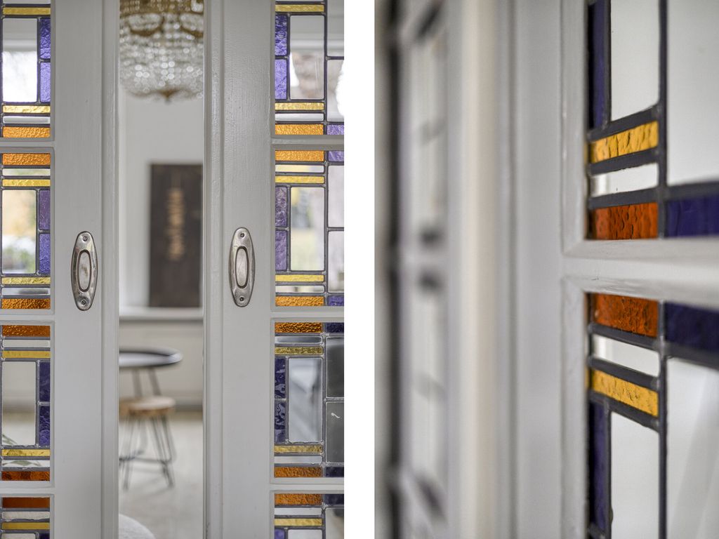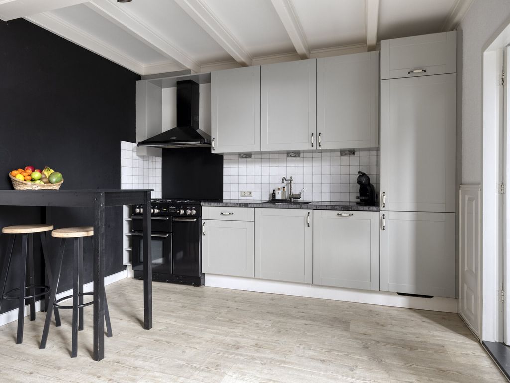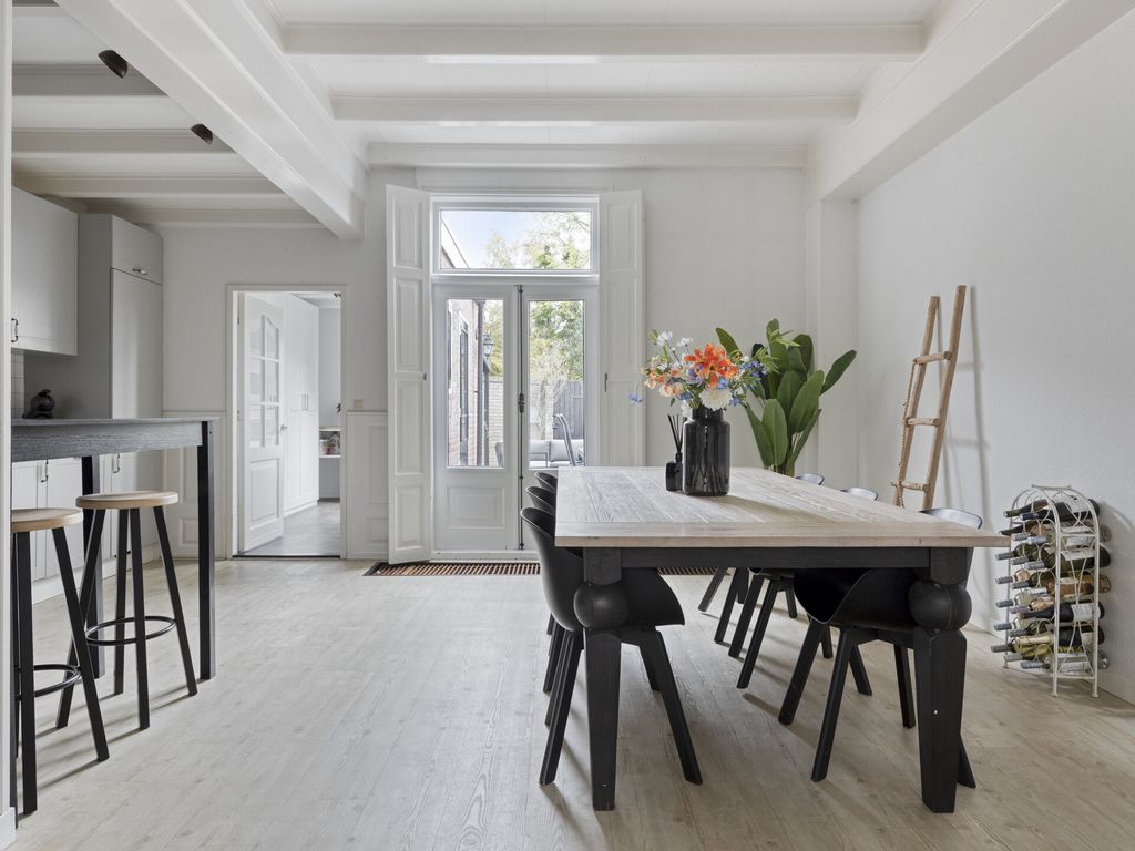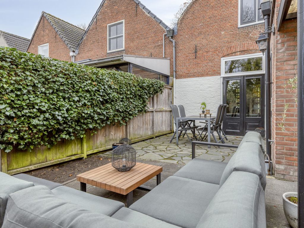 Via de nette entree komt u in de hal met meterkast en modern toilet. Onder de trap bevindt zich een praktische voorraadkast. De woonkamer ademt sfeer dankzij de fraaie haardpartij en de authentieke schuifdeuren met glas-in-lood, die de zitkamer subtiel scheiden van de eetkamer. De robuuste open keuken is een echte eyecatcher en van alle gemakken voorzien: een stoer fornuis met drie ovens, afzuigkap, koelkast, vaatwasser en een stijlvol stenen werkblad. Openslaande deuren zorgen voor een open verbinding met de achtertuin. Achter de keuken bevindt zich een ruime bijkeuken met wasmachineopstelling en extra bergruimte. De bijkeuken is enkele jaren terug volledig gerenoveerd. De gehele begane grond is afgewerkt met een fraaie vloer die zorgt voor een warme uitstraling.