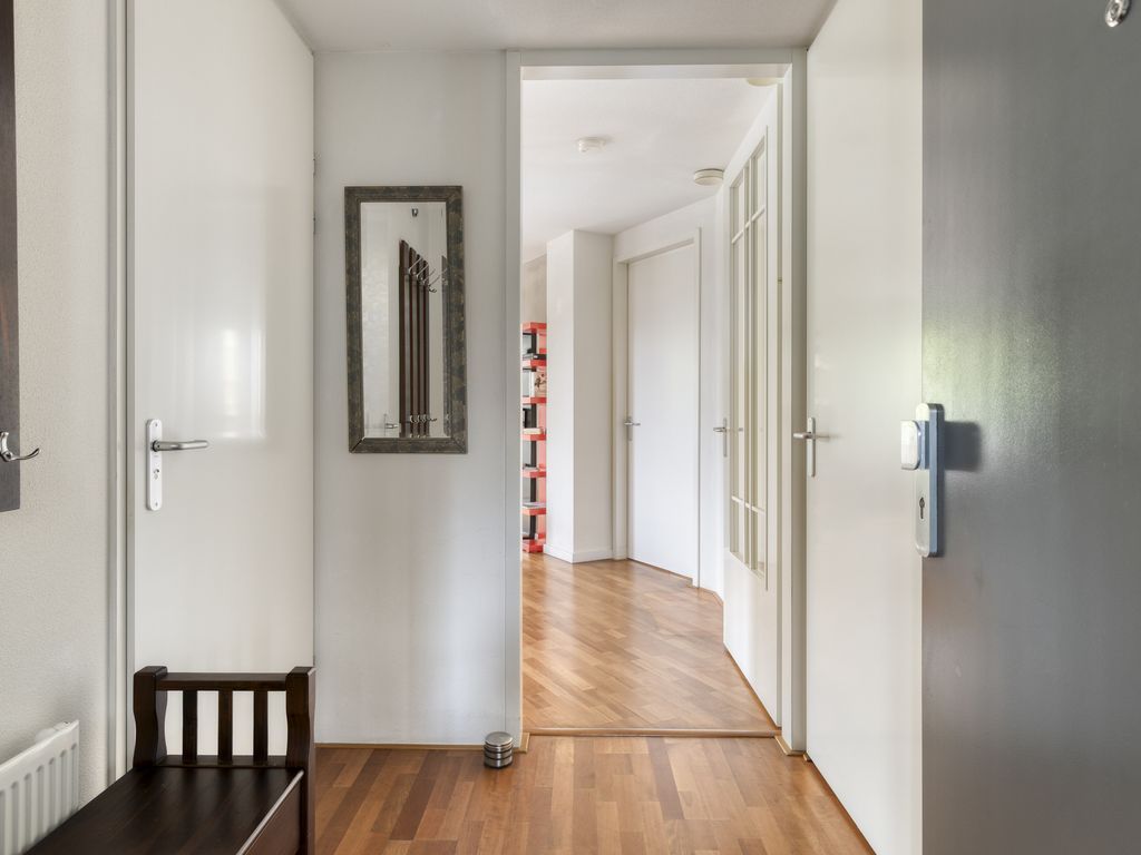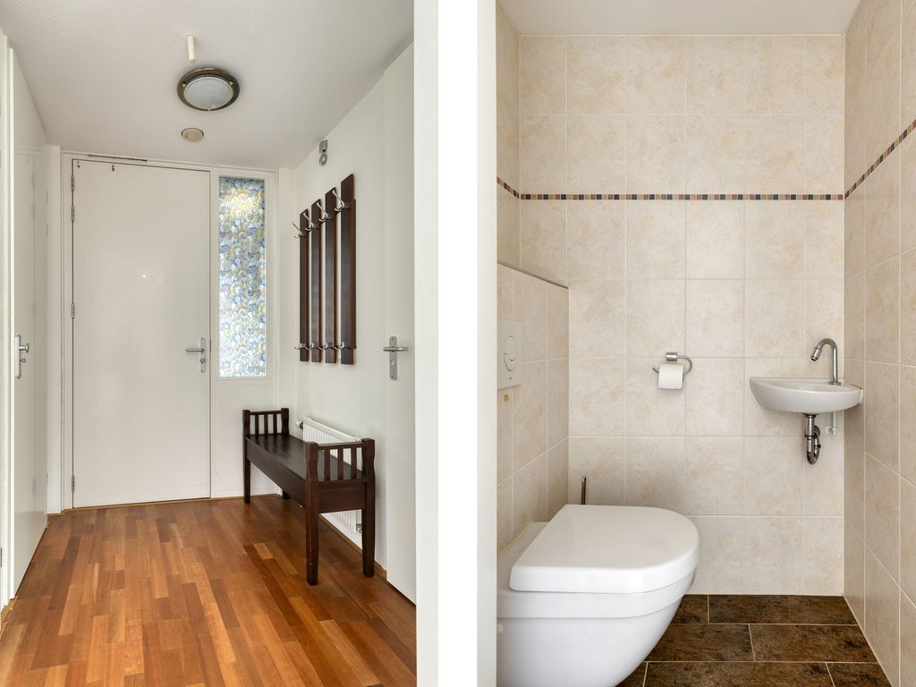 Via de centrale entree met intercom, lift en trap bereikt u het appartement op de 1e verdieping. Binnengekomen in de hal treft u hier de moderne meterkast, ruime berging met wasmachine-aansluiting, CV-opstelling (Remeha, 2025) en de mechanische ventilatie. Verder is in de hal ook de toiletruimte gesitueerd welke netjes is betegeld en voorzien is van een hangtoilet en fonteintje.