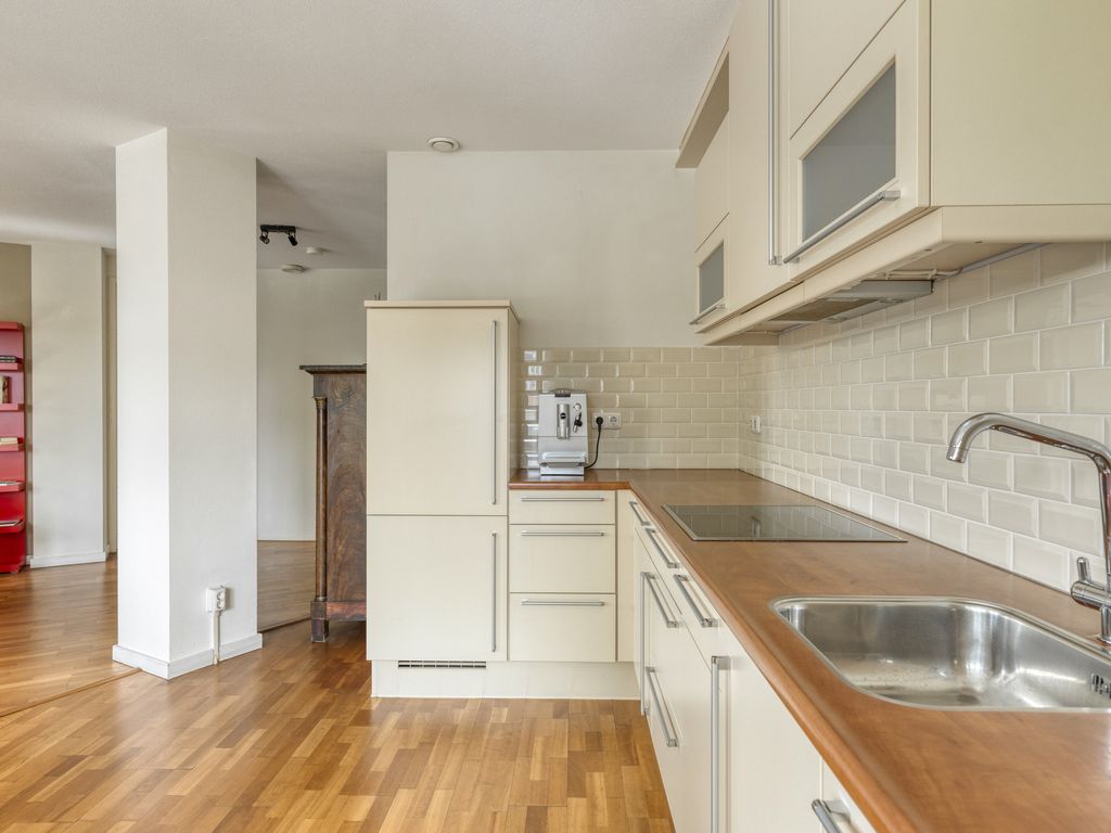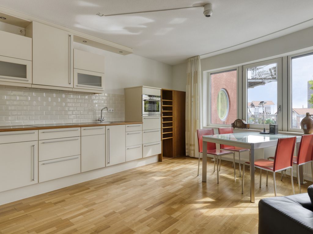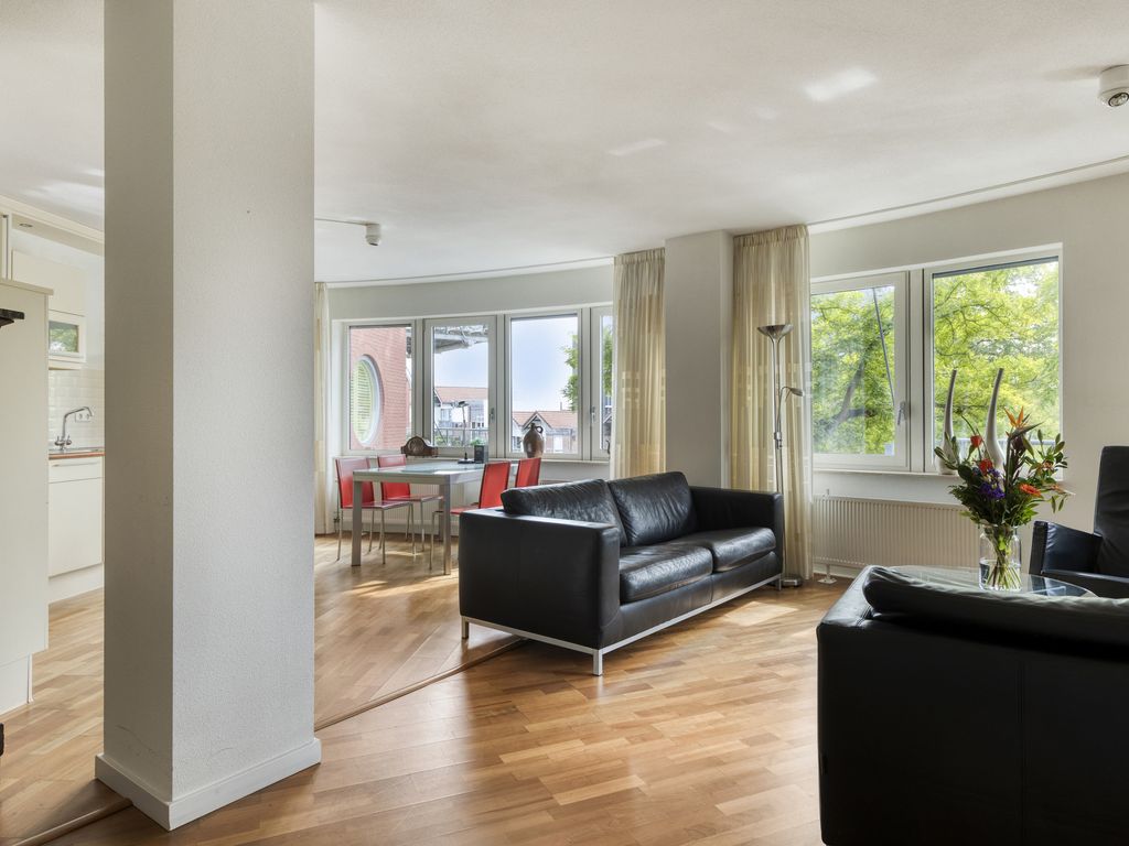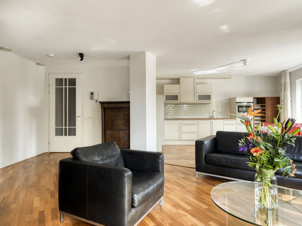 Vanuit de hal bereikt u de lichte en ruime woonkamer. Deze vormt het hart van de woning. Dankzij de grote raampartijen geniet u hier van een prettige lichtinval en een schitterend uitzicht op groen maar ook op de levendigheid van de binnestad. De open keuken is netjes uitgevoerd en uitgerust met alle gemakken: een vaatwasser, combi-oven, keramische 4-pits kookplaat en een koel-/vriescombinatie.