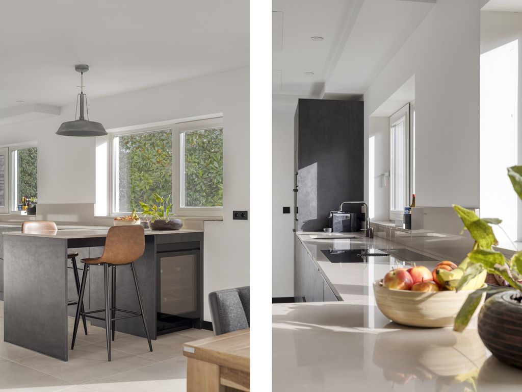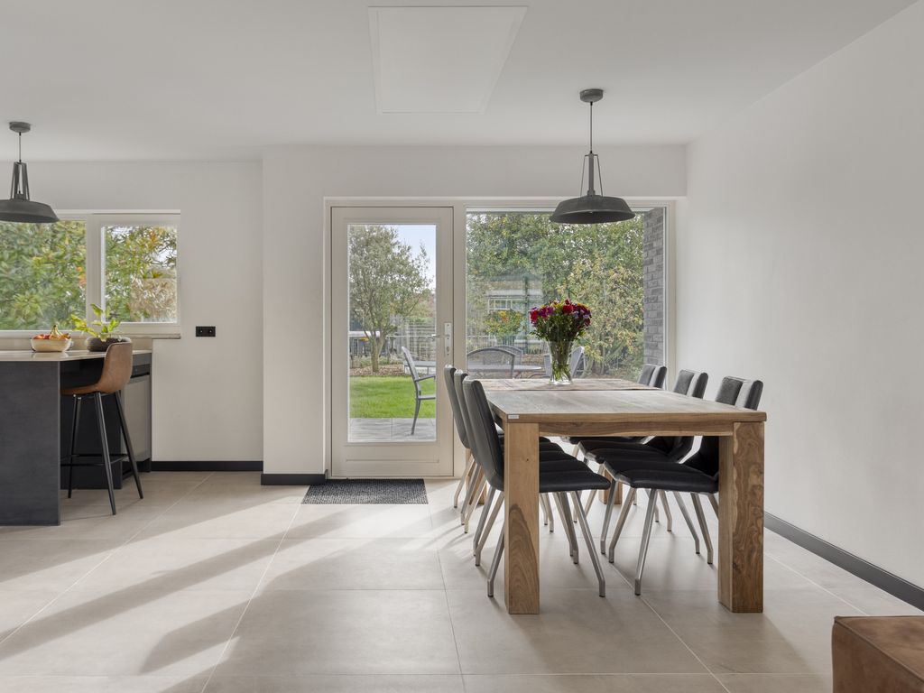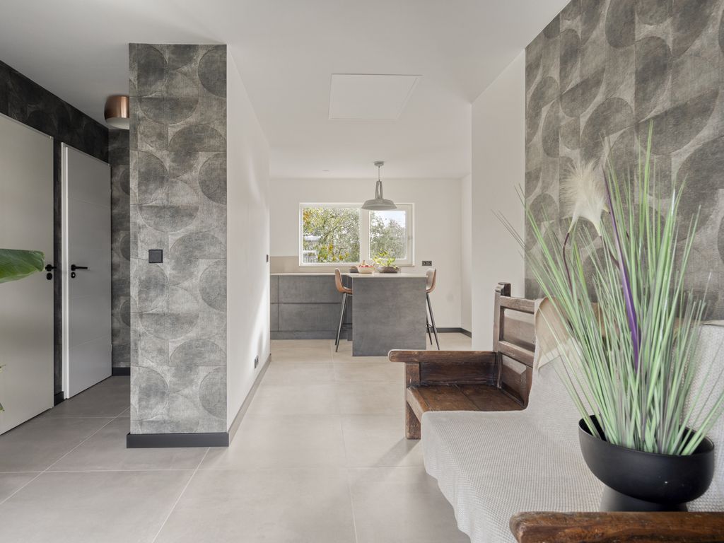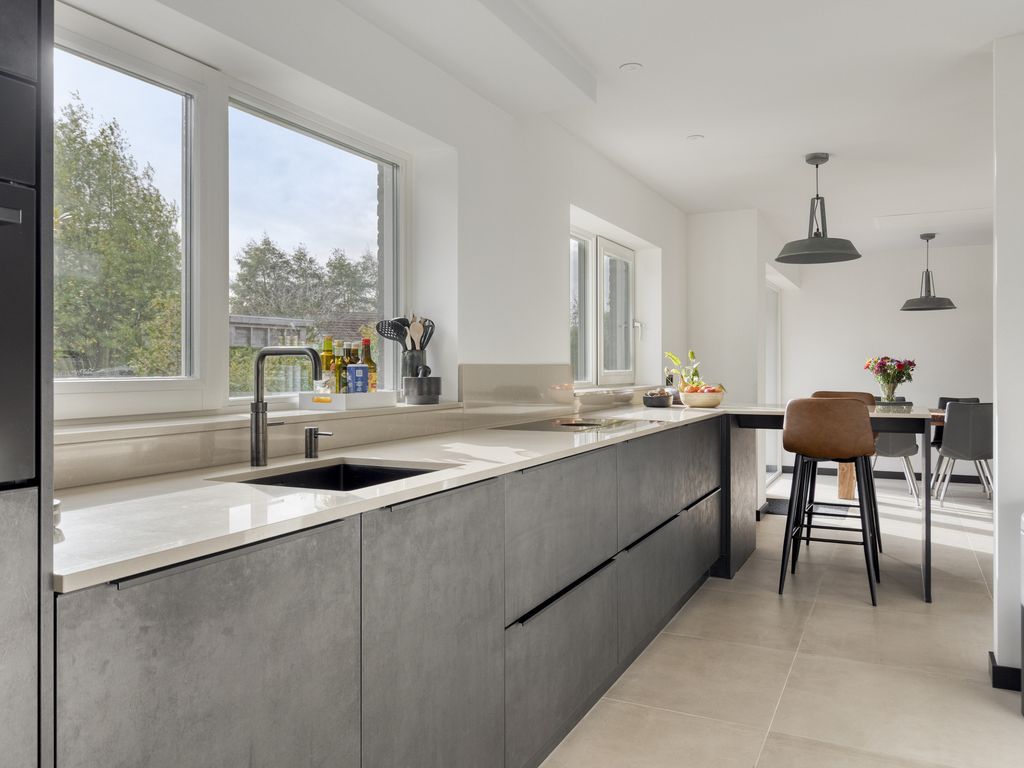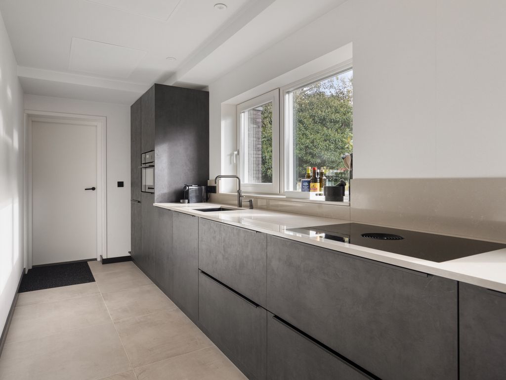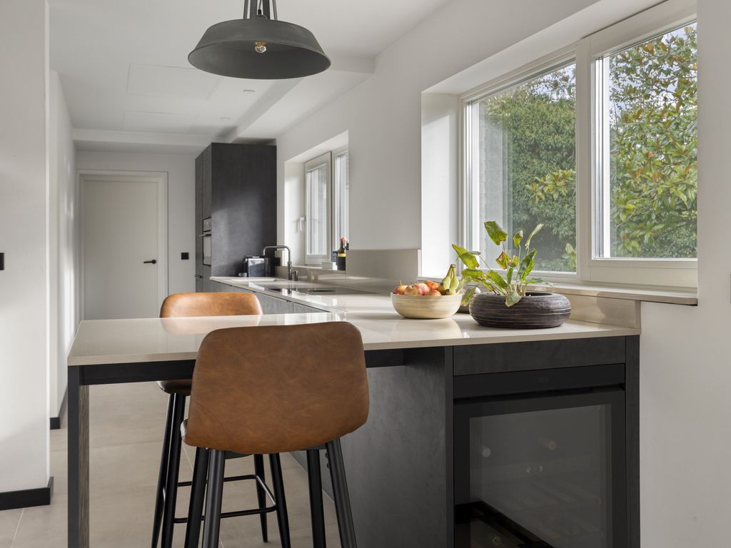 De hal leidt naar het woongedeelte met aan de ene zijde de moderne keuken en aan de andere zijde de lichte woonkamer. Grote ramen zorgen voor veel daglicht en een loopdeur biedt toegang tot het terras achter de woning. De luxe keuken is voorzien van inductiekookplaat met bladafzuiging, koelkast, vriezer, combi-oven, wijnklimaatkast en Quooker. Aan de keuken bevind zich ook een ontbijtbar met zitje.