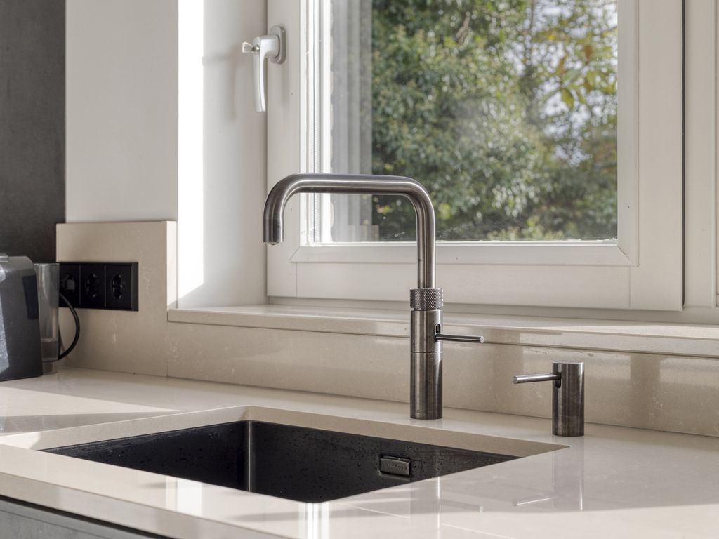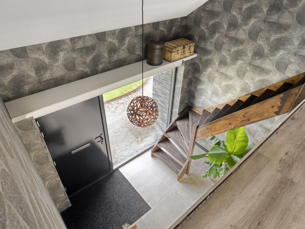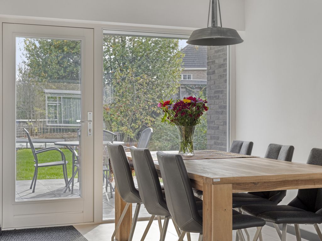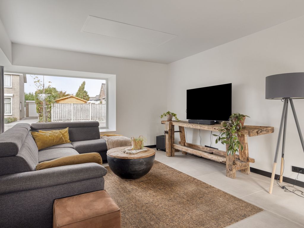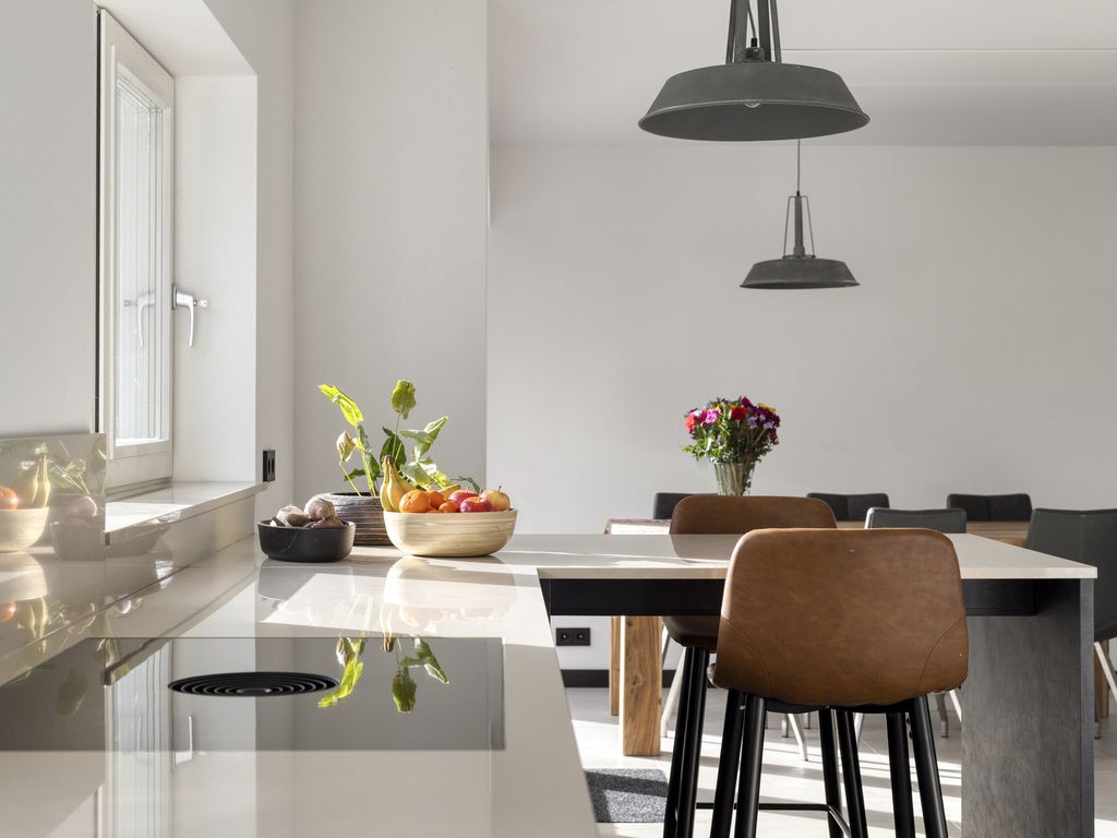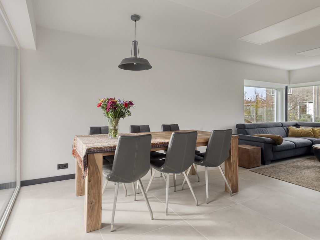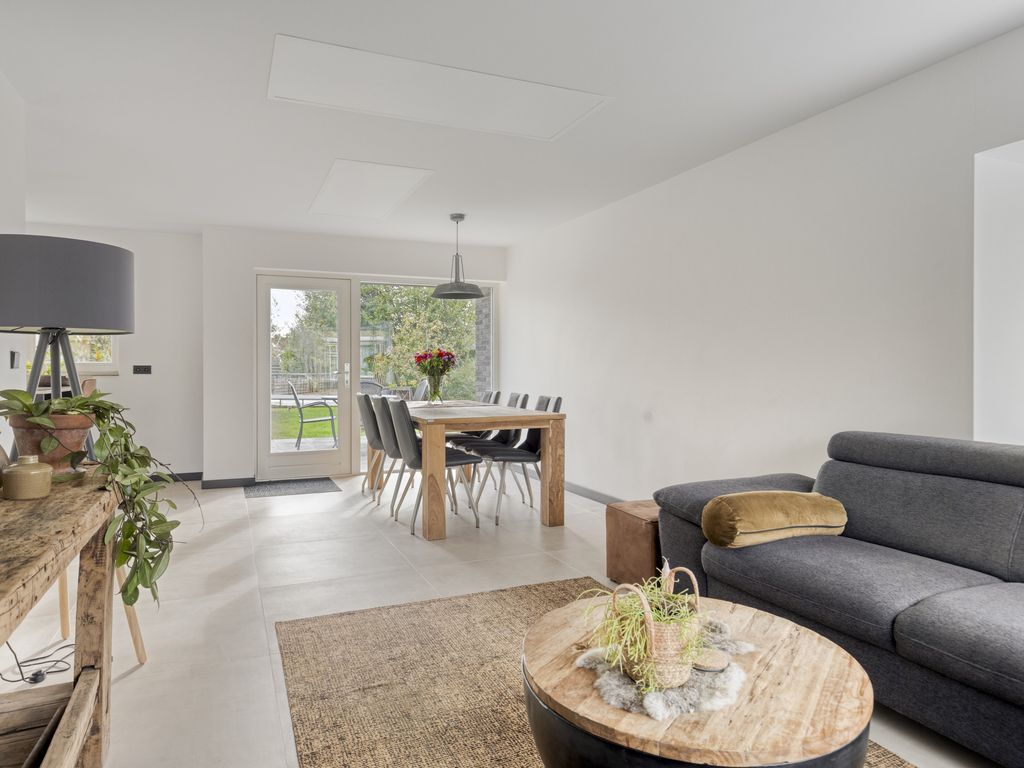 De hal leidt naar het woongedeelte met aan de ene zijde de moderne keuken en aan de andere zijde de lichte woonkamer. Grote ramen zorgen voor veel daglicht en een loopdeur biedt toegang tot het terras achter de woning. De luxe keuken is voorzien van inductiekookplaat met bladafzuiging, koelkast, vriezer, combi-oven, wijnklimaatkast en Quooker. Aan de keuken bevind zich ook een ontbijtbar met zitje.