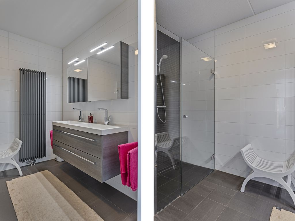 Er is een ruime ontvangsthal met gang die in directe verbinding staat met alle vertrekken. In de hal ligt een moderne antraciete keramische tegelvloer, die doorloopt tot in de ouderslaapkamer en woonkamer. Aan de rechterzijde van de gang treft u de badkamer, bijkeuken en de toiletruimte. De toiletruimte is keurig uitgevoerd met wandcloset, fonteintje en een moderne witte wandtegels in combinatie met antraciete vloertegels. In de bijkeuken hangt de cv-ketel, wtw-installatie en zijn er aansluitpunten voor wasmachine en droger. Aan de linkerzijde staat een praktische, grote voorraadkast en aan de rechterzijde is een klein aanrecht met spoelbak en onder- en bovenkasten aangebracht. De luxe badkamer heeft een fraaie vloer- en wandtegels, een luxe wandmeubel met dubbele wastafel en spiegelkast, een wandkast, een designradiator en een grote inloopdouche met hardglazendeur.