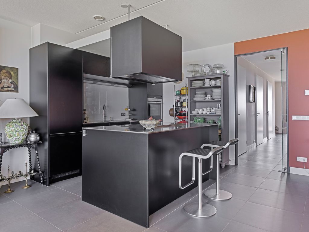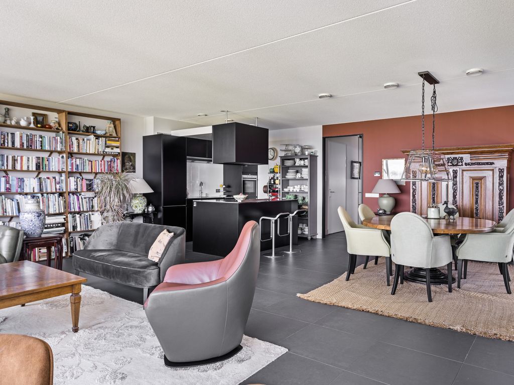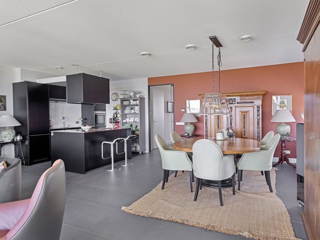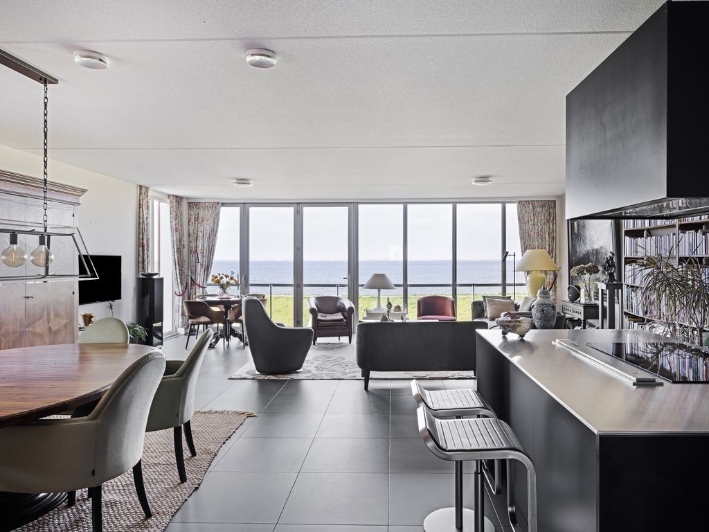Zodra u de woonkamer betreedt krijgt u het ‘wauw’-gevoel van het prachtige, weidse uitzicht op de Oosterschelde dat nooit zal vervelen. De sfeervolle woonkamer met halfopen keuken met circa 65 m² woonoppervlak biedt door haar riante afmetingen van 7,28 m. bij 8,91 m. een heerlijke lichte living, mede door de kamerbrede raampartij, die reikt tot aan het plafond, en de twee op het noordwesten gelegen zijramen. U heeft daardoor, waar u zich ook bevindt in de woonkamer, altijd uitzicht op de mooie omgeving. Vanuit de woonkamer heeft u via de schuifdeur toegang tot het 'zeembalkon'. Wanneer de schuifdeur helemaal open staat kunt u ook in de woonkamer genieten van de volle zon, als ware het een zonneterras. Bij entree van de woonkamer treft u gelijk rechts de luxe Siematic keuken aan. De keuken is in matzwarte kleur uitgevoerd in combinatie met een kookeiland en rvs. werkbladen. Het is een praktische en complete keuken die voorzien is van de volgende apparatuur: inductiekookplaat met 2 afzuigsystemen, oven, koel-vriescombinatie en vaatwasser en quooker. Bijzonder is het dubbele afzuigsysteem van de kookplaat. Het kookeiland vormt tevens een natuurlijke overgang naar de woonkamer.