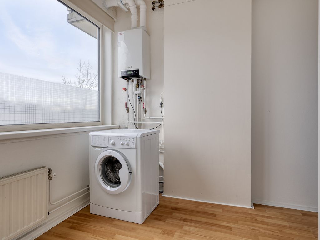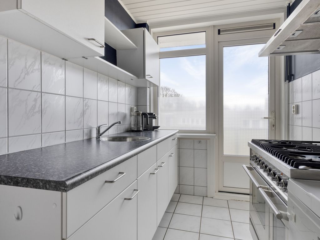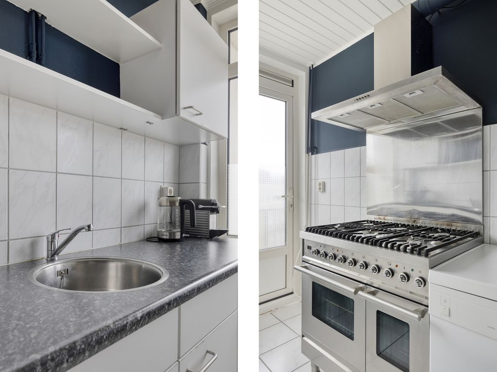 De keuken is compleet ingericht met diverse apparatuur, waaronder een spoelbak, een zes-pits gasstel met oven en afzuigkap. De koel-vriescombinatie is eventueel ter overname. Er is voldoende kastruimte en vanuit de keuken bereikt u het balkon aan de voorzijde.
