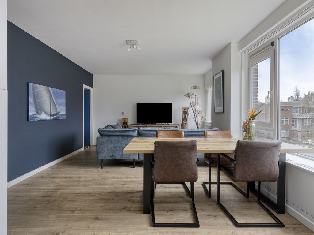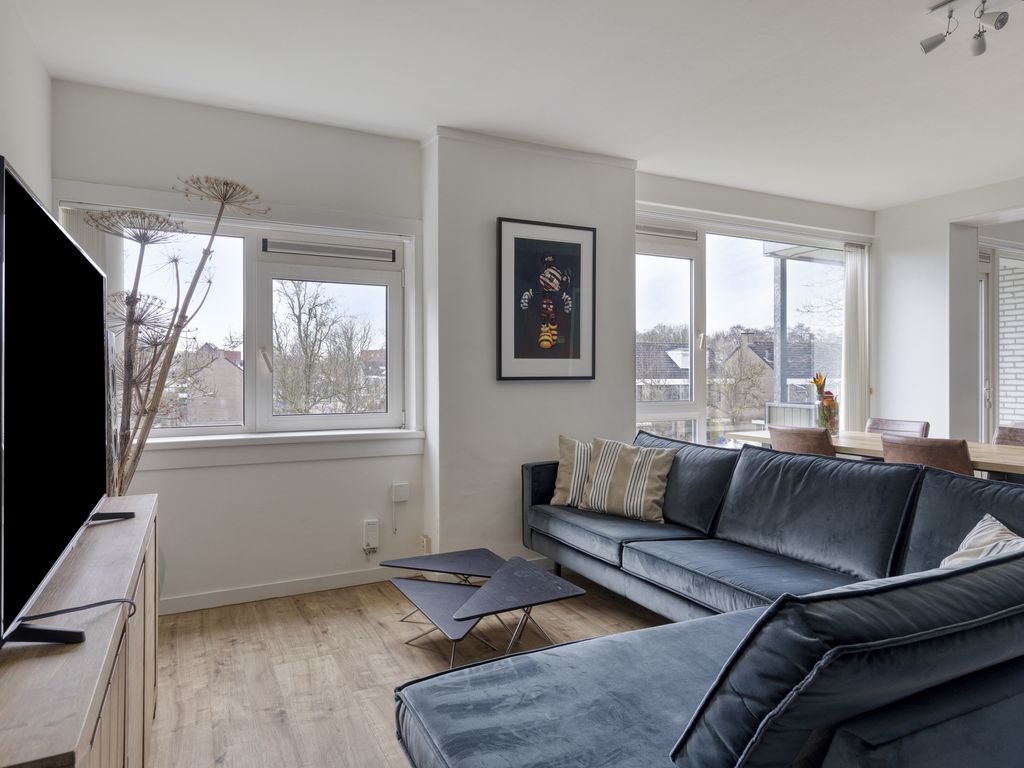 De lichte woonkamer is voorzien van drie hoge ramen en een fraaie vloer. Doordat in het verleden een slaapkamer bij de woonkamer is betrokken, is er een royale en lichte ruimte ontstaan met plaats voor een comfortabele zithoek, een eethoek en een extra gedeelte dat kan dienen als thuiswerkplek, speelkamer of hobbyruimte. De woonkamer ligt aan de achterzijde van het complex en biedt uitzicht op een groenstrook met daarachter een woonwijk. Aan deze zijde bevindt zich ook één van de balkons.